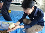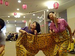 二人一組で社員手作りのデカパンを息を合わせて履く作業から始まります!息が合わないとなかなか履けないデカパン。
