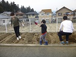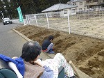 芽がでてきたジャガイモを半分に切って草木灰を切り口につけ植え付け