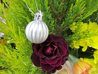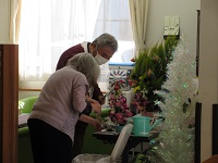 クリスマスツリーに見立てオーナメントや赤と緑の水引きを飾った可愛らしい作品が完成しました。