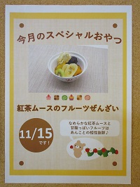 11月のスペシャルおやつは「紅茶のムースのフルーツぜんざい」でした。