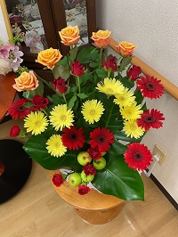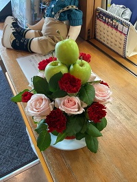 今回はリンゴを使ったアレンジメントで、時間が経つと赤く熟してくるそうです。