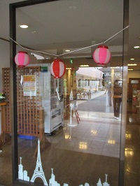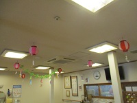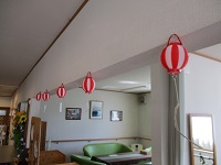 玄関には施設名入りの提灯を飾り、ラウンジには小さめの提灯や手のひらサイズの提灯を飾りました。