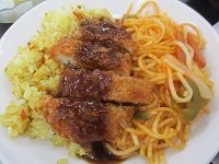 カレー味のピラフとナポリタンのパスタを並べて盛り付け、その上にとんかつ、デミグラスソースをかけることが多いです。長崎の喫茶店などの飲食店でよく提供されているメニューで、お店ごとにピラフやパスタの味付けが変わっていたり、かけるソースがカレールウなどになっているそうです。