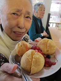 大きなシュークリームにいちごやベリーソースなどが盛り付けられていて、いちごがたくさん味わえるおやつでした。