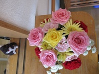 赤色やピンク色などのお花が使用されていて、可愛らしいアレンジメントになっています