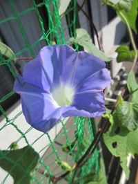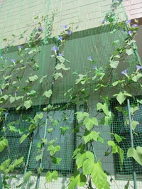 青色と紫色に白いラインの入った2種類の朝顔が20輪くらい咲きました