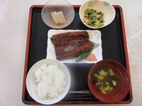 昼食のメニューはご飯・清まし汁・うなぎの蒲焼・和え物・水菓子でした