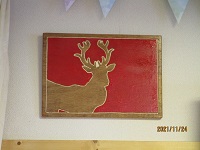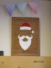 2階食堂のテレビの両脇には、サンタとトナカイのクラフトが飾られています。