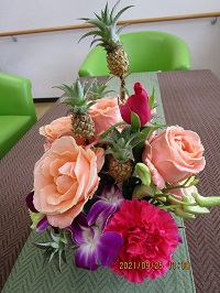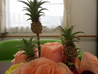小さい方には、バラやカーネーションと一緒に小さいパイナップル🍍が隠れています。南国みたいな可愛らしいアレンジメントになっています。