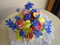小さい方は、柔らかな色合いの花にデルフィニウムの青色が映えるアレンジメントになっています。