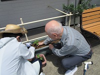 緑のカーテンをつくるため、プランターに朝顔を植えました。