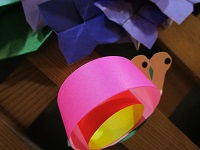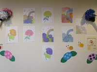 ステーションの壁には、折り紙と画用紙でつくられた青い紫陽花とカラフルなかたつむりが飾られています。