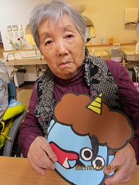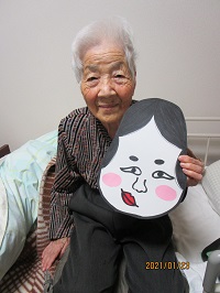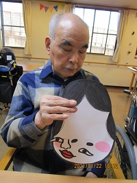 皆様が作って下さった福笑いは2階食堂に飾られています。