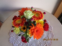 小さい生け花もガーベラやカーネーションを使って、オレンジ色がメインで元気の出るお花になっています。