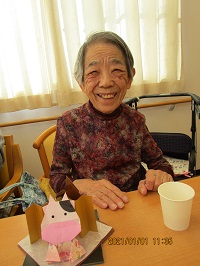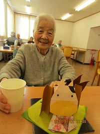 折り紙で作られた今年の干支「丑」と「一富士二鷹三茄子」のオブジェと一緒に写真を撮りました。