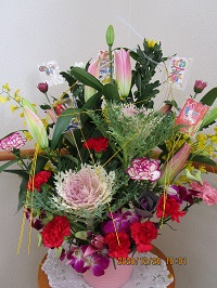 百合・葉牡丹・菊・カーネーションでお正月モチーフの華やかな生け花になっています。