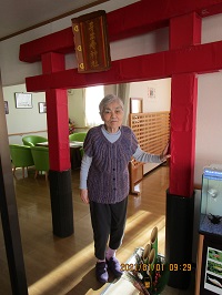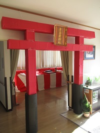 手作りの大きな鳥居の前で写真を撮り、お参り後はおみくじを引きました。