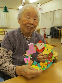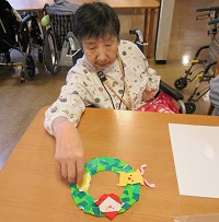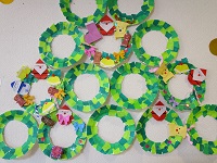 折り紙のサンタやトナカイがカワイイリースを作り、そのリースをクリスマスツリーに見立てた壁飾りが完成しました。