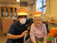終了後は栗やキノコのお面をかぶり、柿のスティックを持って写真撮影をしました!