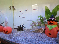 色々な種類の魚たちと🎃のオレンジが映えて、とても華やかな水槽になっています。