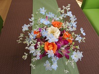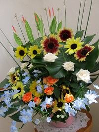 デルフィニウム・バラ・ひまわり等、色とりどりの生け花になっています。