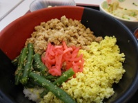 メニューは、三食丼・味噌汁・笹かま・フルーツです