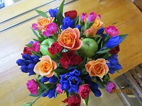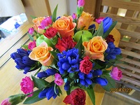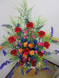 カーネーション・バラ・りんどうなど色鮮やかな生け花になっています。