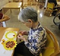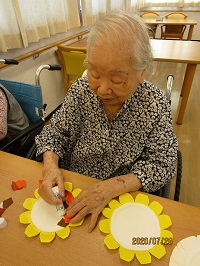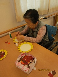 紙皿を使って作成したのですが、折り紙を外側だけに貼ったりや綺麗に並べて柄を作ったり、色々なひまわりが出来ました。