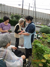 天候の悪い日が続いていたのであまり大きくならず残念に思っていると、入居者様が「これは坊ちゃんかぼちゃと言って小さい方が実が詰まっていて美味しいのよ」と教えて下さり、これから収穫できるかぼちゃが楽しみになりました。