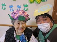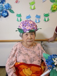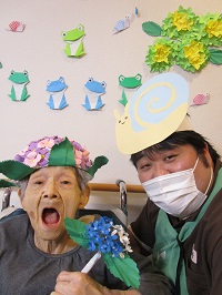 紫陽花の帽子やかたつむりのお面をかぶり記念撮影をしました。