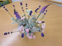 応接室や受付に飾ってあった生け花が枯れてしまったので、いつもお庭のお手入れをして下さるナースさんにお願いをして、お庭に咲いているラベンダーやバラを使い可愛く生けてもらいました。