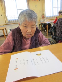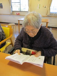タンバリン・マラカスを使い真剣に歌集をみつめています。