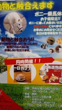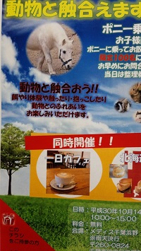 参加予定はポニー(お子様は乗馬可能)うさぎ、モルモット、ひよこ、ヤギ、きんせんがめ、パンダマウスの予定です。