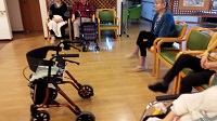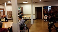 入居者様は毎日の日課のラジオ体操を元気よく行い本日の予定を確認されています。