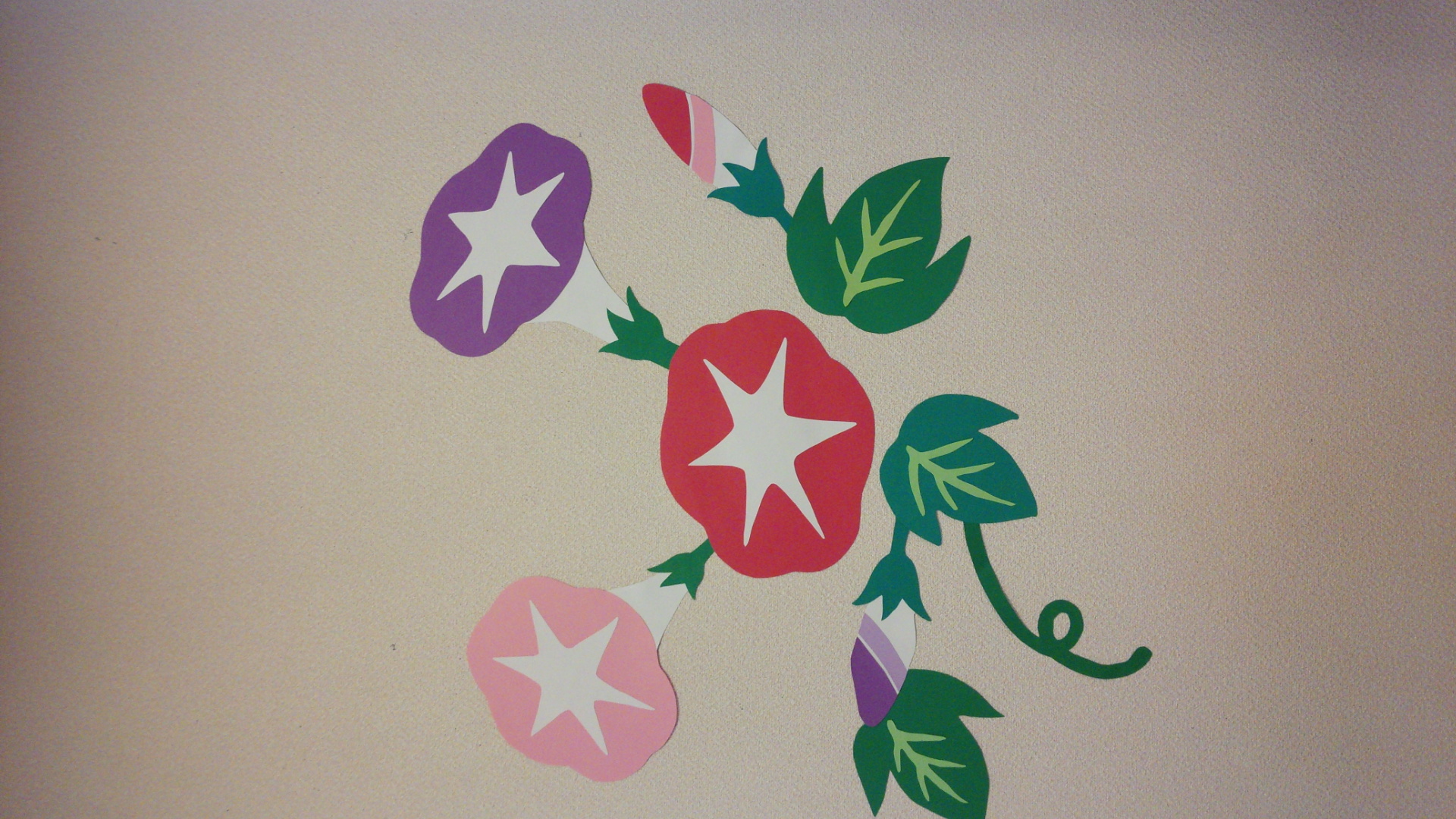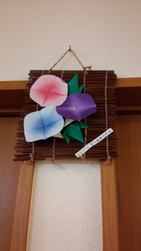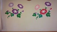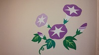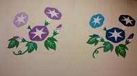 食堂の壁に季節感のある朝顔の花をたくさん飾りました。