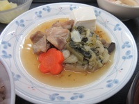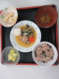 メニューは、赤飯、清まし汁、鶏肉水炊き風、板わさ、フルーツです