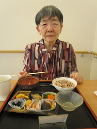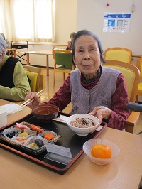 甘くて温かい甘酒に癒され、入居者様に合わせた形態のおせち料理を楽しんで頂きました
