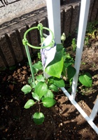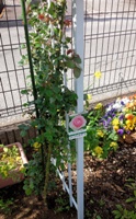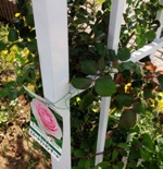 白いばらのアーチにピンクのバラとクレマチスを植えました。