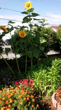 スクスクと育っており、大きなひまわりは施設の玄間から良く見えて