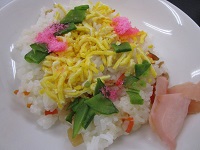 今日の昼食のメニューは ちらし寿司・清まし汁・炊き合わせ・フルーツ でした