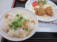 メニューは筍ご飯・味噌汁・チキン南蛮・炊き合わせ・杏仁フルーツです