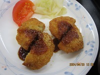 メニューはご飯・清まし汁・味噌カツ・煮酢和え・フルーツです
