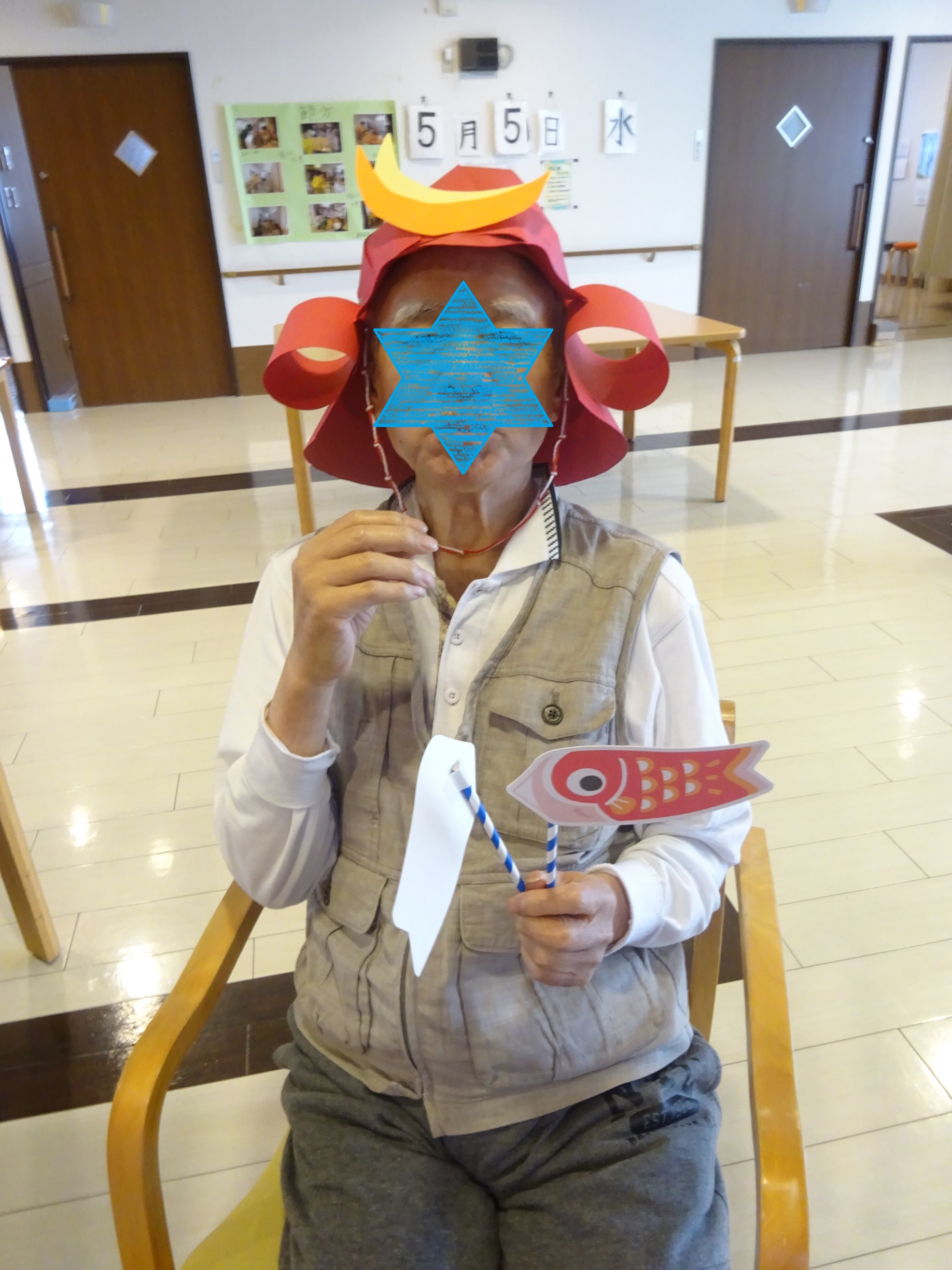 昨日はこどもの日ということで、職員手作りの兜をかぶってレクリエーションです。