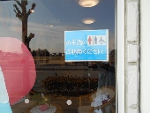 玄関前はキティちゃんコラボののぼり旗とパンジーの花壇が目印です。