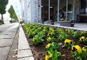 キレイに植えられたパンジーとキティちゃんののぼりとの