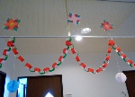 1階と同様に天井からはクリスマスカラーの飾りつけです。
