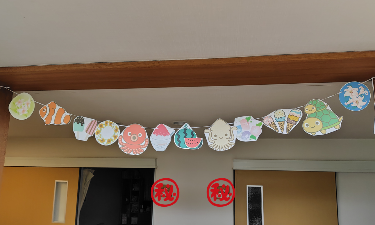 施設に飾っているガーランドを夏っぽくしましたよ!