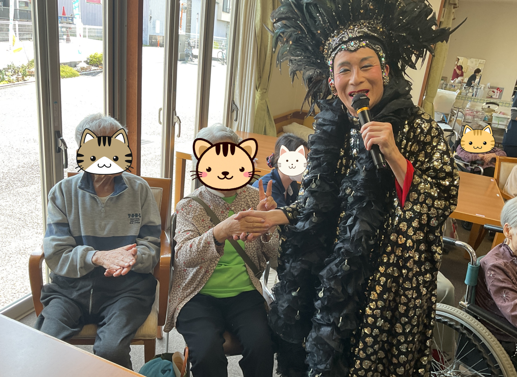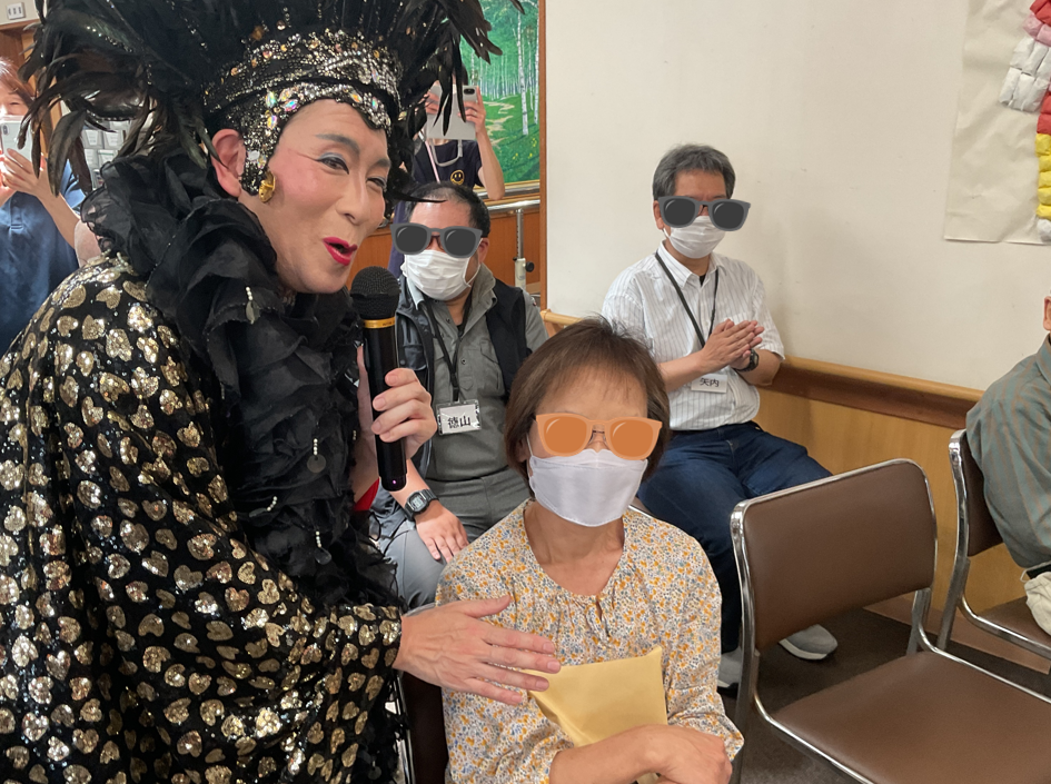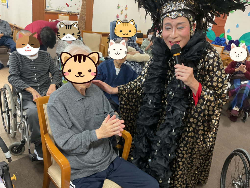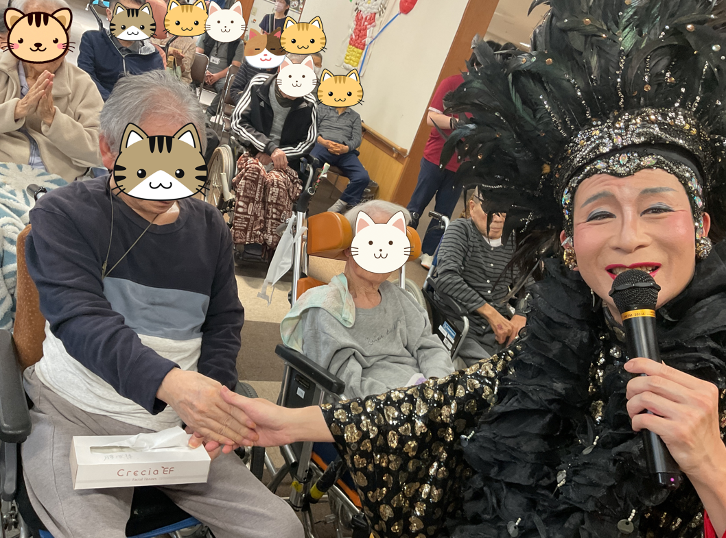 歌謡ショーが始まると客席側にまりもちゃんが降りてきて、お客様一人ひとりと握手や方に手を当てて