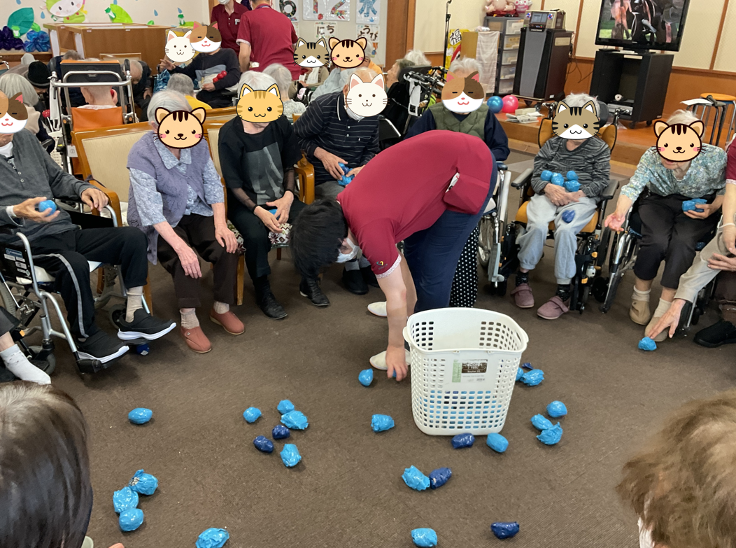 お手玉5個がカップいっぱいになるので以外とすんなり渡せなかったり、落としてしまうなどうまく行かないようす。一方、競技開始で眠くなって居眠りする方もいるなど前途多難な運動会スタートとなりました。
