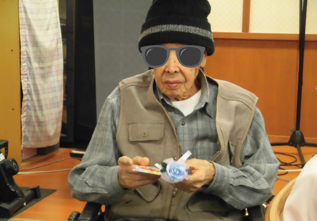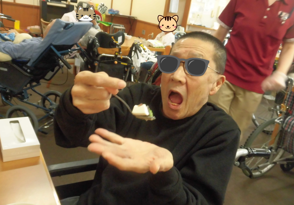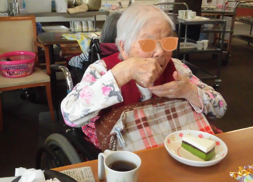 対象の入居者様に花とバースデーカードを手渡し、みんなでお祝いの歌をプレゼントしその後ケーキを食べました(^^)